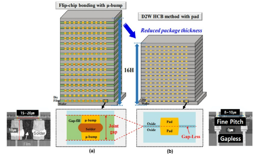 Hybrid bonding enables direct Cu-to-Cu (copper-to-copper) bonding between stacked dies without the use of micro-bump. This solution offers much tighter pitch, lower resistance and better thermal characteristics. Hybrid bonding supports below 10μm pitch (vs ~40-55μm for microbumps), allowing many more connections between layers. With a tighter bump pitch and no gap between HBM dies, the overall stack height of HBM can also be reduced.