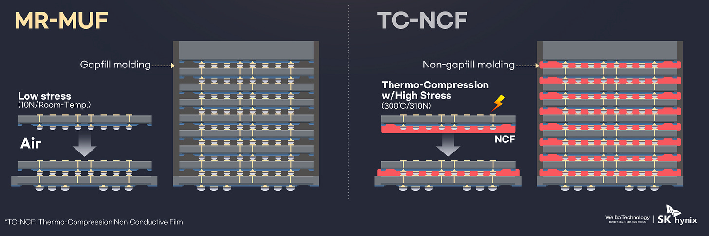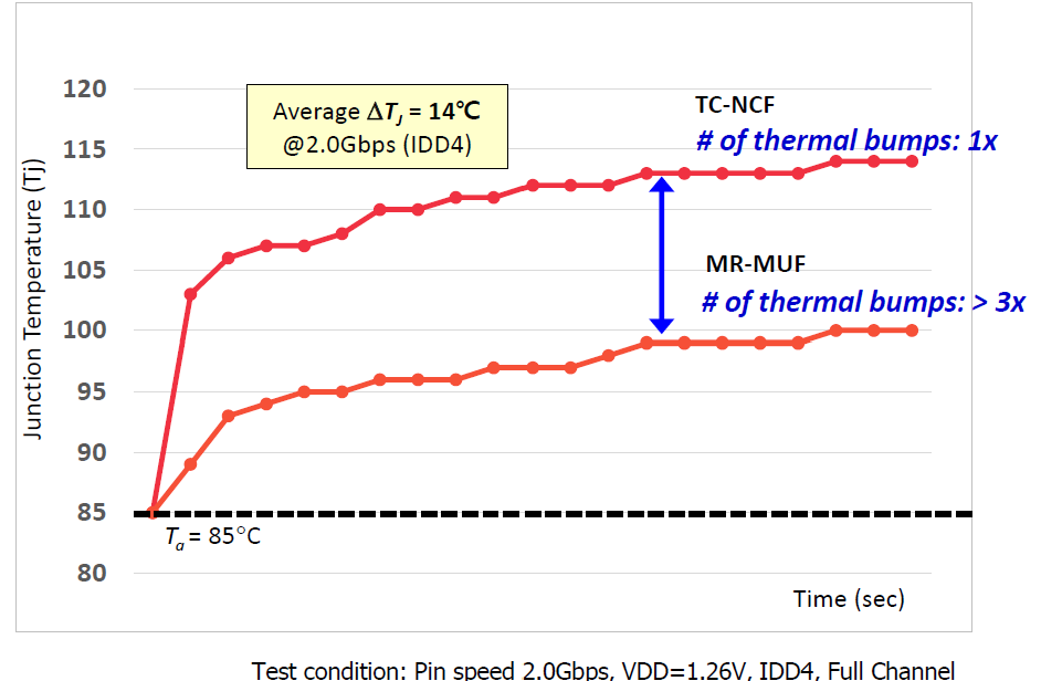 Another feature of MR-MUF is that the process is done at room temperature and with small force, while TC-NCF is done at high temperature of 3000C and strong force. High temperature creates potential warpage issues where the layer will become bent. Strong force also has the potential to damage chips during the stacking process.