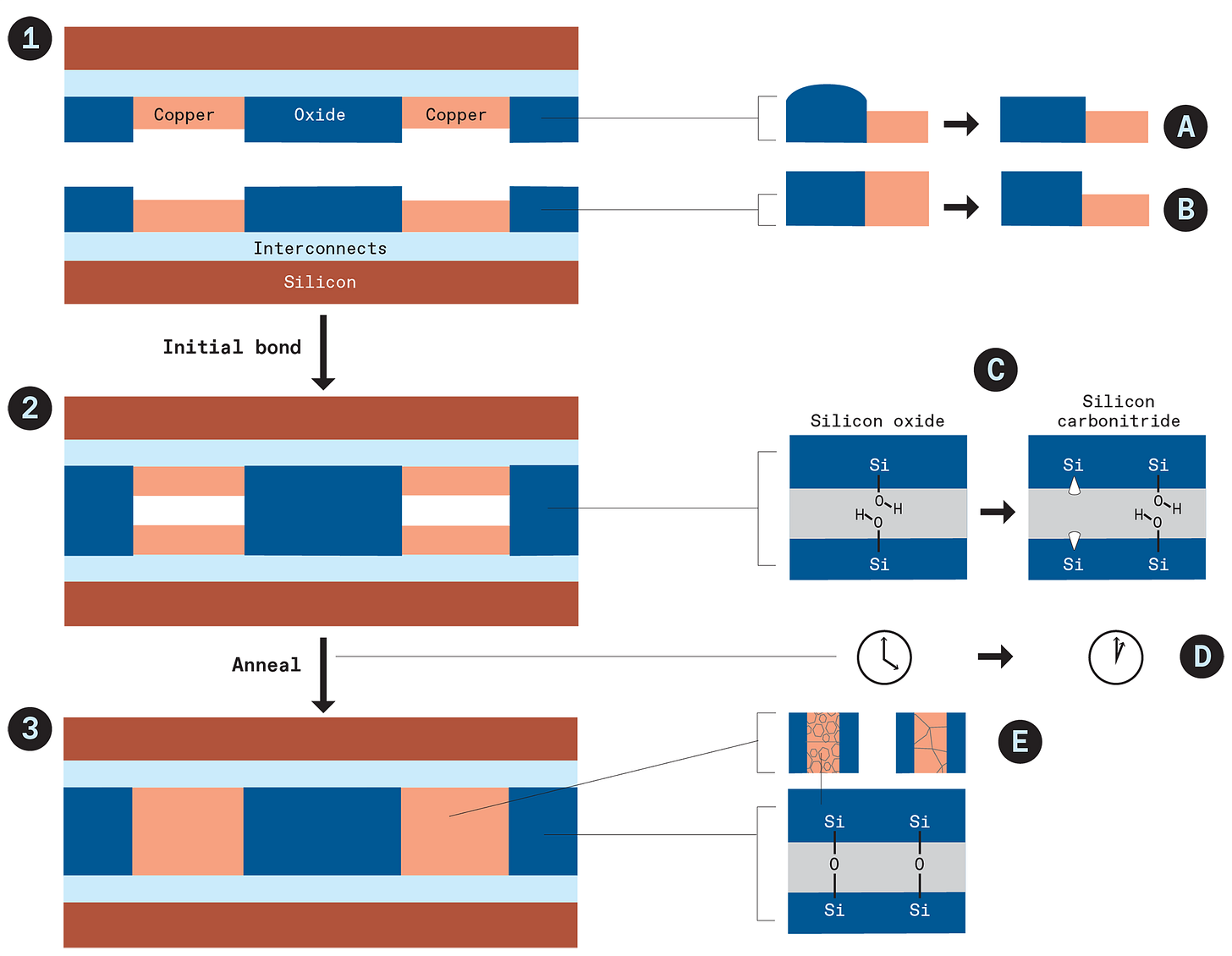 In hybrid bonding for HBM, the process begins with surface preparation of the die to be bonded, creating planarized copper pads and surrounding dielectric layers. These surfaces are then chemically treated and activated to ensure high-quality adhesion. Next, the dies are precisely aligned and directly bonded to form both a copper-to-copper connection and a dielectric-to-dielectric mechanical bond. Once bonded, the stack undergoes low-temperature annealing (typically <400°C) to strengthen the interconnects.