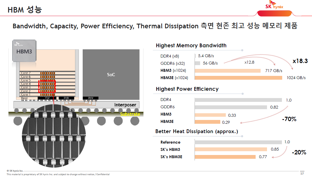 More than 3000 through-silicon vias per die. (*Samsung’s HBM2 has > 5000 TSVs per die and SK Hynix’s HBM3 > 8000 TSVs per die)
