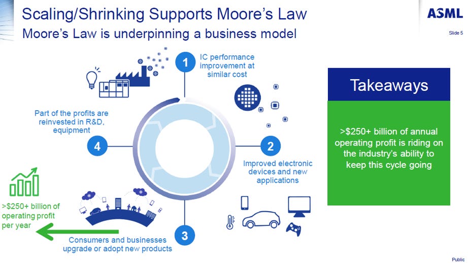 Best explained by ASML, Moore’s Law is in fact a business model of the semiconductor industry. The continuous improvement in transistors cost drives improvement in performance, power consumption and cost of the end devices. We have gone from mainframe to PC, smartphone and now AI. These new and better devices enlarge TAM for the semiconductor industry with a part of the profit reinvested in R&D to continue the Moore’s Law.