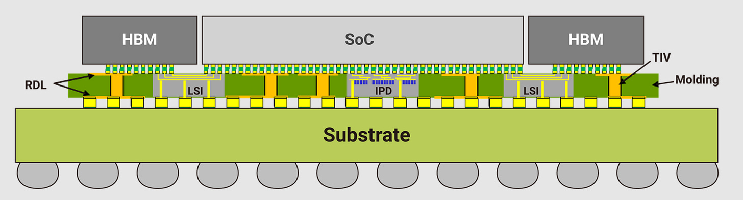 HBM (High Bandwidth Memory) has gained prominence in this current AI upcycle. Through stacking 8 to 16 DRAM dies vertically and connected TSV (through silicon via), much higher bandwidth can be achieved in the packaged module. TSMC’s CoWoS-S process connects the HBM and GPU dies through the silicon interposer for Nvidia’s H100. Nvidia’s next generation B100 will utilise TSMC’s CoWoS-L which can support bigger package size through the use of redistribution layer.