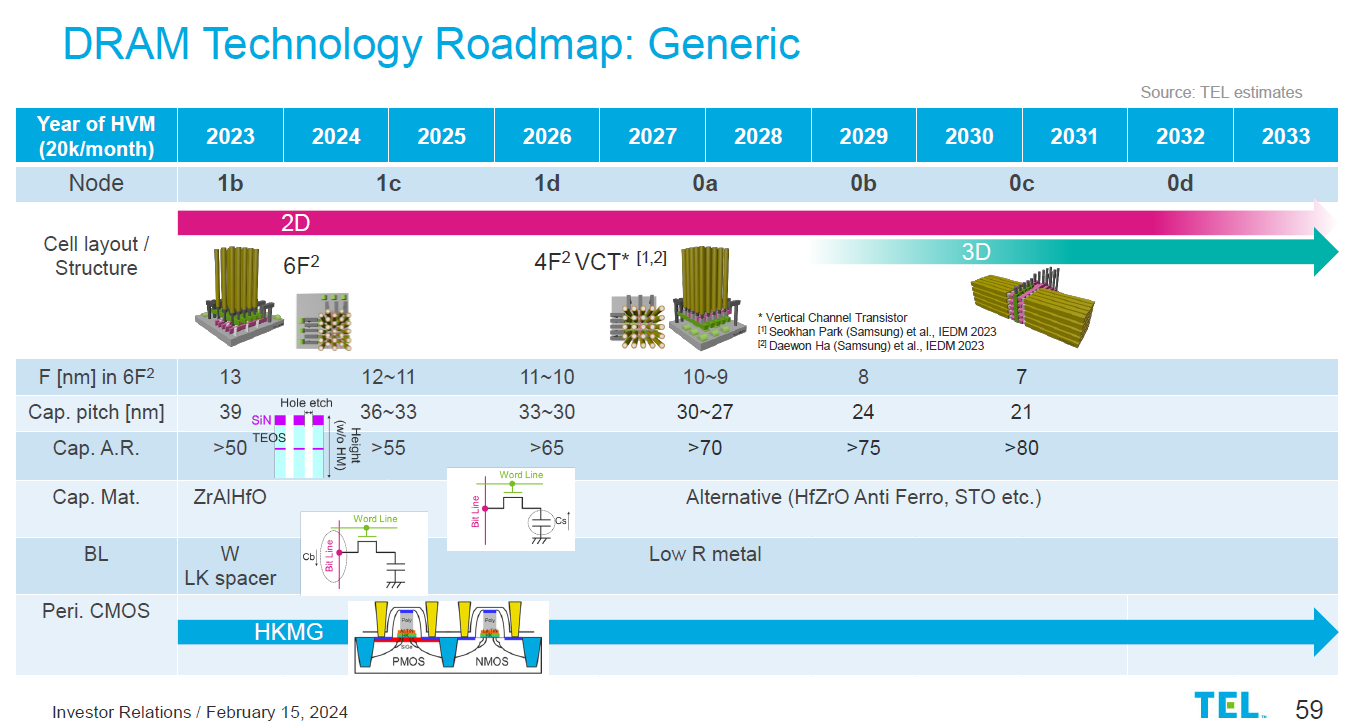 For DRAM, EUV insertion will be the key as they migrate beyond 1z nm. Samsung and Hynix are moving on to 1c nm which will have 6 to 8 layers of EUV. Micron will be introducing EUV to its 1-gamma node in 2025. DRAM producers will gradually increase the number of EUV layers before High-NA EUV is used. 3D DRAM will arrive in the next decade, although 3D DRAM is very different from 3D NAND.