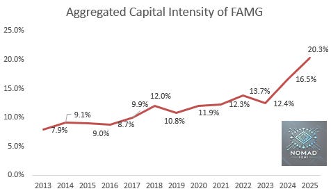Capex intensity (capex-to-sales ratio) is now at an all-time high, putting pressure on free cash flow. FAMG are expected to spend 50-70% of their operating cash flow on capex in 2025. Capex can rise either through revenue growth or higher capital intensity. In 2024 and 2025, the sharp spike in capex spending by the FAMG has led to a notable decline in free cash flow. Historically, during periods of economic uncertainty or slower growth, the FAMG have responded with inventory digestion or capex moderation, as seen in 2019 and again in early 2022.