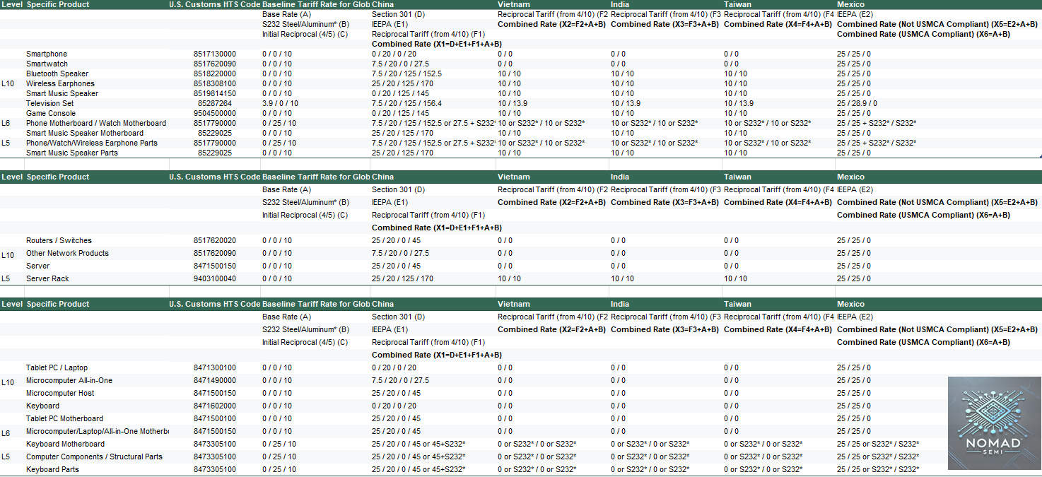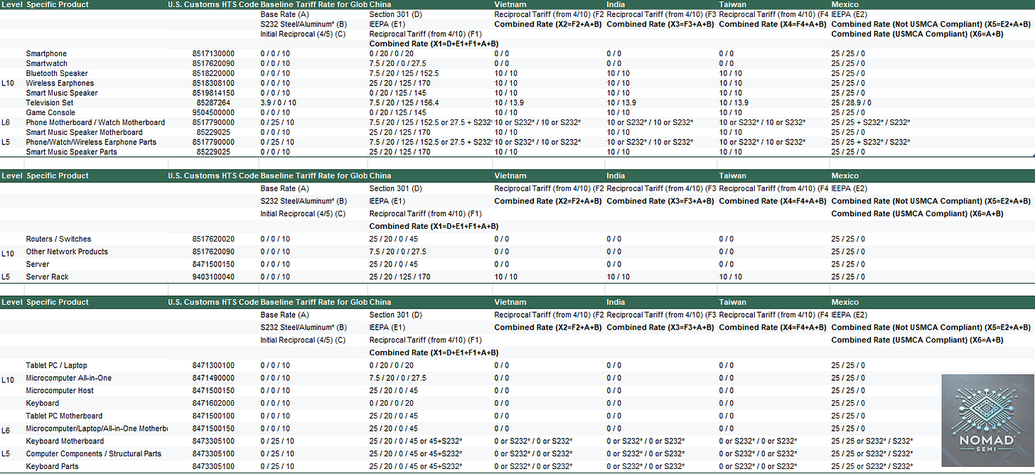 On 9th April, the Trump administration signaled potential exemptions and a 90-day pause on reciprocal tariffs to facilitate trade negotiations, though the tariffs on Chinese imports remained in effect. Few days later, it was revealed that the U.S. Customs and Border Protection agency has exempted certain electronics products such as smartphone, PC, network equipment from reciprocal tariff. As it stands today, these are the current tariff rate according to Foxconn: