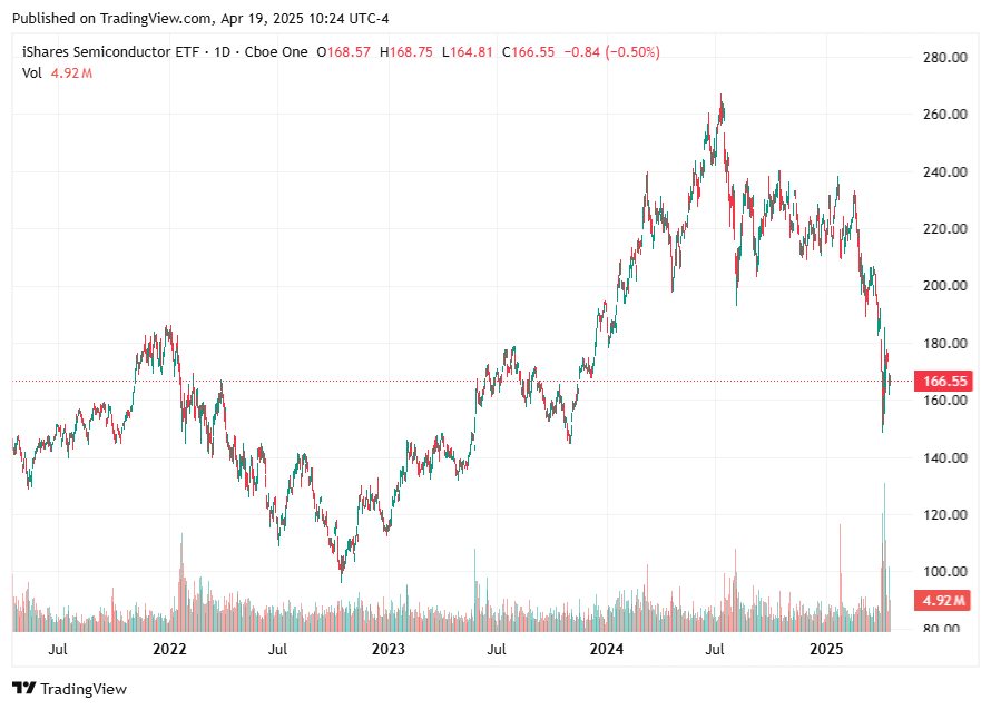 The current 37% drawdown in SOXX is already approaching the 49% seen during the 2022 downcycle. While historical drawdowns aren't always directly comparable, it's worth noting that the sector saw much deeper declines of 60-70% following the Dot-Com Bubble and the 2008 Global Financial Crisis. Conversely, corrections were more modest at more than 30% during the 2018 and COVID downturns, when macroeconomic conditions were relatively more benign.